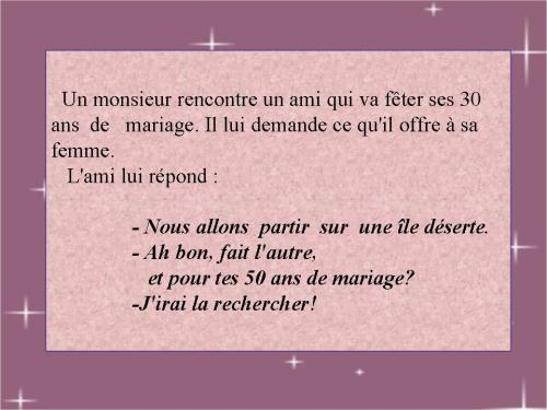 Un jour une femme appelle sont homme sur son portable: "Allo vieux poivrot, où tu es encore?" " Ah ma chérie, tu te souviens quand il y a quelques années on se balladait main dans la main? Nous nous étions arrêtés devant une bijouterie. . .. Tu avais vu une bague que tu aimais vraiment. Et je t'avais dit qu'un jour, quand j'aurai les moyens. . .." " Oh mon chéri, tu es un amour!!!!" " Bein tu vois je suis dans le bar juste à côté!" :-q :-q :-q :-q :-q |