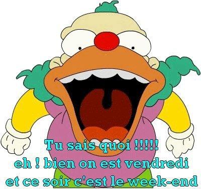 un passage rapide pour vous souhaiter un bon week-end en image humoristique. :D j'espere que tout va bien pour chacunes de vous :-q ici il fait super beau depuis quelques jours B-) le printemps arrive :-q a nous les petites robes legeres :D pour ma part dur-dur je ne suis pas tres bonne eleve en ce moment :-bd Mme balance me fait la tete et ce week encore invitation :P mais un jour je les aurais c'est f----s kilos. . . :D bonne journée a toutes. . .@+ bises. . . |
