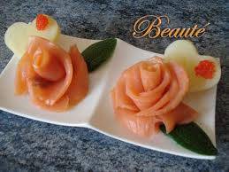 150g de saumon fume 2pomme de terre qque grains de sel 1pot d'oeuf de lump peler et couper les pde terre en rondelle avec le porte piece decouper les coeur cuire 20a25min, laiser refroidir decouper le saumon en fines tranche de 5cm poser sur la pde terre en formant une rose disposer sur des coupelle decore avec les oeufs de lumps (a la place des p de terre je prend aussi du pain de mie ,et je decore de rondelle de citron) voila bon appetit |