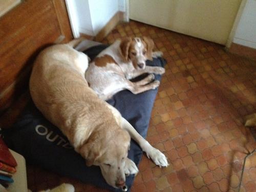 Alors vous vous préparez a refaire la fête, ma petite infirmerie m'a offert un coffret pour faire des macarons il faut que je m'y mette j'ai l'impression qu'il y a beaucoup de manip. Un peu marre de la grisaille hélas ne ne pouvons pas changer la meteo, ou amies il faut partir au soleil hi hi, maus cette année nous avons pas mal voyage il font refaire notre cagnotte. Michele soigne toi bien , pas drôle de rester au lit avec la grippe, heureusement ta fille peut te chouchouter. Une petite photo de mon Itak avec la vieille chienne de mon fils que nous gardons pendant qu'ils sont au soleil. Je vous embrasse Momo |