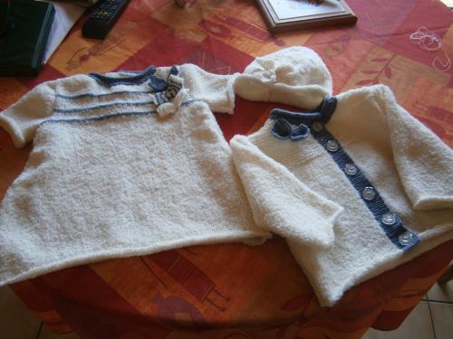 Hier soir j'ai terminé une petit ensemble (robe, gilet et bonnet ) pour le BB de ma nièce . Voilà ce que cela donne.