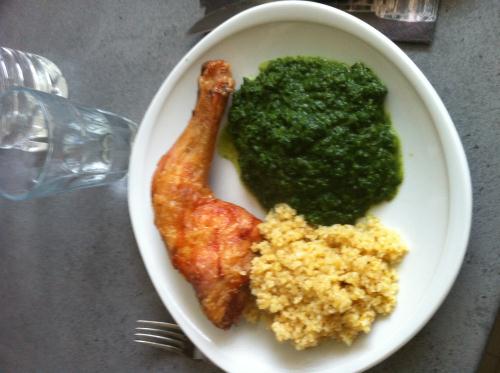 Ce midi, j'ai fait simple pas beaucoup de temps pour cuisiner. Une cuisse de poulet dégraissée au préalable mais cuite avec la peau et je l'ai enlevée (beurk) pour la manger avec 100 gr d'épinard à la crème 4% et 100 gr de boulgour cuit ensuite 100 gr de faisselle et au goûter 1 poire. Ce soir, ce sera une soupe maison sans féculent, 1/2 avocat, 1 yaourt aux fruits 0% et ce sera bon.