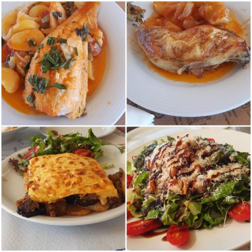 Coucou d une taverne qu on aime bien. Ce midi beau filet de poisson pour moi et poulet pour mon homme. Photo dessous autre jour moussaka et salade avec octopus