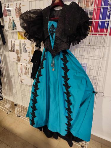 robe bal 1890, taffetas de soie turquoise + broché de soie noir + detelle constellée de cristaux noirs + tulle pailleté