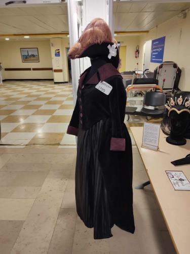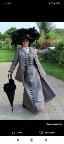 royaliste 1795, redingote velours noir, "daim" violet (couleur du deuil royal) jupe rayée ton sur ton, le cul de paris (coussinet spécial à cette époque pour donner du gonflant au dos du costume). chapeau plumes d autruches dégradés violine, vieux rose. . . + coquarde blanche : couleur du roi.