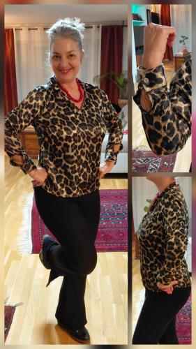 Depuis 2 mois, je galerais sur le patronnage d une blouse style chemisier mais sans patte de boutonnage. J ai enfin calé le patron et cousu un prototype en satin de polyester leopard. Je prepare une prochaine version en tissu plus noble. |