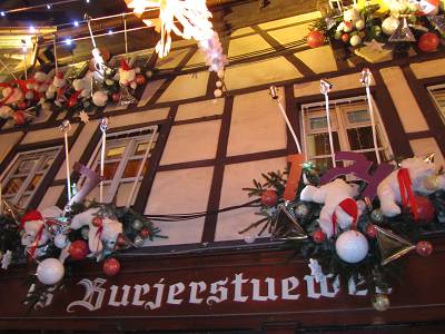 déco de la façade du restaurant "Chez Yvonne" (lieu fétiche de J. Chirac pour déguster sa "tête de veau vinaigrette" dans le quartier de la cathédrale !)