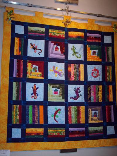 c'est vrai que cette maladie, c'est un vrai fléau et les chercheurs feraient bien de trouver de quoi la combattre, je suis de tout coeur avec celles qui subissent ça dans leur famille; chez nous, c'est une soeur de maman qui est atteinte, elle ne reconnait plus du tout aucun de ses enfants, c'est très triste voulez voir les jolis patchs que mes soeurs et moi nous avons fait pour nos enfants ? alors, nous toutes les 5, nous avons établi aussi une tradition: pour chaque enfant de la famille qui se marie, nous préparons un quilt en commun !! chacune en fait un petit morceau et en général, qui c'est qui se tape l'assemblage et le quilting ?, vous avez deviné . . . et oui, c'est bibi :D mais comme j'aime, c'est pas grave !! ;) alors celui-ci a été fait pour mon fils Guillaume et Adeline, ce sont des geckos, ils les aiment et en élèvent dans leur vivarium, :-O de plus les geckos ont fait partie du quotidien de Guillaume qui est arrivé avec nous en Afrique à l'âge de 5 mois et ce genre de bestioles ne lui faisait pas peur, comme tous les enfants (tout le contraire de moi @-) ) |