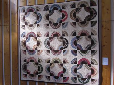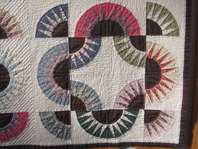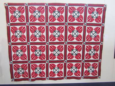 et qui sert à maintenir ensemble les 3 couches d'un quilt: le "top" qui est le dessus (la partie jolie piécée ou appliquée) + le dessous (qui est fait en général d'une seule pièce de tissu) + la doublure de ouatine (qui peut être plus ou moins épaisse (moins, c'est plus facile pour matelasser et plus, c'est plus épais, donc plus chaud) :D je ne sais pas si on voit la précision et la régularité, et la taille des points de quilting (matelassage), et le nombre (il y en a des milliers ou plus :P ) il parait qu'une bonne quilteuse Américaine fait jusqu'à 5 points au CM :-q :-q :-q , moi, j'vous assure que j'en suis incapable :-O ce modèle de patch est la "POMEGRANATE", c'est-à-dire la "GRENADE", (donc ça c'est sa fleur) car dans leurs quilts traditionnels, les Américaines aimaient représenter des objets et des fruits ou fleurs de leur vie de tous les jours |