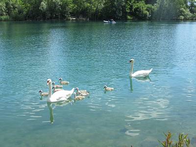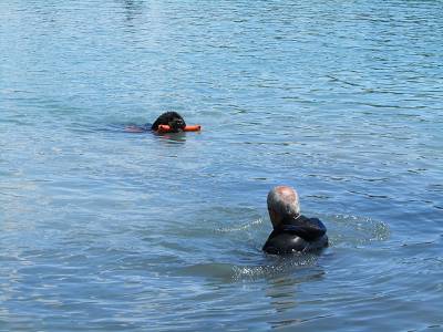 tout au fond, à environ 2m50/3m derrière le bateau, je ne sais pas si vous voyez un petit point sombre dans l'eau: c'est FLOCON qui nage, il s'entraîne au "suivi de bateau" !! :D il nage comme cela pendant environ 20 à 25 minutes :-q |