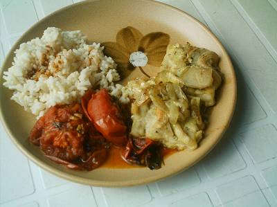 bon apres-midi voici en images mon repas de midi, d'abord mon plat principal puis l'assiette dessert |