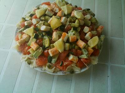 sinon je viens de participer au dernier challenge cuisine de l'été pour une salade à base de pamplemousse rose + avocat + surimis+ yaourt 0%mg-+ cornichons + citron + se+ poivre + tabasco + courgette + farfalles + mayo allégée à 30%mg voici le resultat à servir tres, tres frais, hum! |