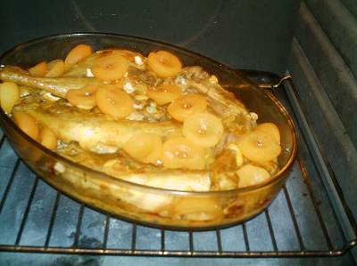 pour 2 personnes: ingredients: 2 cuisses de poulet ou haut de cuisse 4 abricots(au sirop ou frais) 70g d'amandes effilées 1/2 citron 1cs dejus de citron 1cs de miel 1cs de curry 1cs huile tournesol 1 pincée de sel quelques brins de coriandre Préparation.* Allumez votre four à 210°c. Enlevez si vous le souhaitez la peau du poulet Huilez légérement un plat allant au four.Mélangez le miel, le curry et une pincée de sel. Enduisez vos cuisses de poulet avec ce melange, puis roulez le poulet dans les amandes concassées. Mettez au four chaud pendant 10 minutes avant de les retourner.Rajoutez un peu d'eau ou de bouillon de volaille. Pendant ce temps nettoyez et dénoyautez vos abricots s'ils sont frais et coupez-les en 2, ou egouttez votre oreillons d'abricots. Mettez un peu de jus de citron et de coriandre dans le creux de l'abricot. Sortez le poulet du four et placez les abricots dans le plat. Laissez cuire 20 à 30 minutes environ. Le poulet va cuire doucement dans le jus des abricots. Sortez votre poulet du four, reservez l'ensemble et faites réduire le jus s'il est trop important.Servez le poulet chaud recouvert d'amandes avec des abricots et de la coriandre fraiche ciselée ou en grains. astuces: accompagner de riz et de carottes confites au miel. . .régale assuré. . ..bon appétit! |