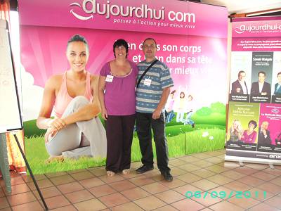 je vois que vous allez assez bien donc je suis vraiment contente pour vous, je dois vous avouer quelque chose j'ai vu Astrid la dieteticienne, et je fais des erreurs depuis quelques temps car elle m'a dit que je dois être ver les 900 calories au lieu de 1400 et que c'est à cause de cela que je ne maigri pas plus et de faire attention car le jour où je ferais un excé mon corps va stoquer et je vais grossir, alors avec toute sa gentillesse astrid m'a donné les bases à reprendre pour rectifier le tir! merci Astric donc vous voyez on fait toujours des erreurs! je savais que j'en faisais mais pas autant! et pour repondre à la question non je ne m'attendais à trouver quelqu'un là-bas suceptible de m'aider dans mes douleurs hier matin mon genou a mechament craquer quand j'étais avec jm gurret et il a entendu lui aussi le bruit! photo de pierre mon mari et moi |