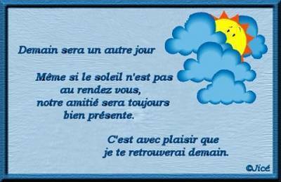 CHANTALOU contente de te revoir sur le forum,bon courage pour tes travaux de nettoyage,la poussière elle va partout,c'est pas facile. . ..CHANCHAN tu as raison de continuer avec la semaine 22,c'est plus simple. . ..MIMI c'est gentil de penser à EVELYNE ,la pauvre elle n'a pas de chance. . .elle a bien besoin de nous . . . ne la laissons pas seule. . ..AMININE tu es très prise par ton travail et ta petite famille. . .bon courage à toi aussi ,tu vas rentrer dans ta petite robe. . ..ne lâche rien ,c'est une bonne motivation. . ...je ne vais pas tarder à aller me coucher,je traîne un rhume et une toux depuis plus de 10 jours. . .ça me met à plat et le moral est un peu en berne. . ..bonne nuit à toutes. . ..bisous. . ..à demain. . .. :-* :-* :-* |