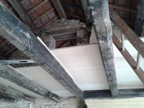 Nous avons commencer aussi le plafond du haut (de l'étage) mais il ne restait plus de clou. Je me suis servi de la scie circulaire une énorme et lourde . Olivier me disait les mesures et moi je mesurais et couper sur mesure avec même des fois faire des encoches mais j'ai réussi. Au début j'avais peur de me couper ou de rater mais fière j'ai réussi.