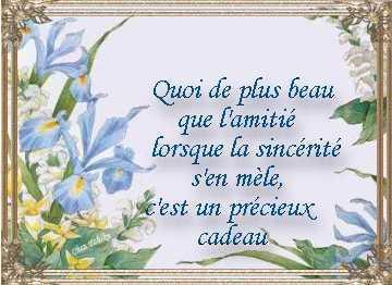 Tu as raison les problèmes sont évoqué et aussi les moments de bonheur. Si les confidences sont souvent faite ici c'est souvent parce qu'elle ne peut être faite auprès de personne d'autre dans l'entourage. . . Ne pas jeter la pierre est ma devise, au contraire remonter le moral des troupes pour voir le verre à moitié plein et non à moitié vide ;) Merci de ton passage et de tes interventions auprès de nous, c'est un réel plaisir. :-q Mes 3 bonheurs de la journée ont été : - un très agréable moment passé avec un ami en début de matinée - un barbecue à la campagne chez un couple d'amis et leurs enfants suivi d'une après midi et soirée dans le jardin à parler de tout et de rien - un magnifique feu d'artifice plein de couleur qui remplit le coeur Je vous souhaite une très belle journée ensoleillée Bises à toutes et à tous |