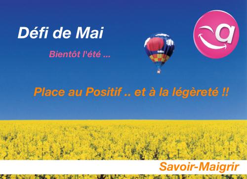 Nous pourrons aussi nous retrouver là-bas ;) En mai fais ce qu'il te plait, mais en mai dépense-toi plus que jamais, car c'est en mai que ton corps de l'été naît ! Oh oh c'est avec cette pointe de poésie que nous allons lancer cette nouvelle animation minceur pour commencer dès maintenant à bien préparer notre corps à l'arrivée de l'été !!! Alors quel va être le défi Minceur Collectif sur le Forum de ce mois de mai ? >> Défi de Mai : Bientôt l'été, place au positif et à la légèreté ! du lundi 18 au dimanche 31 mai *** Un fil conducteur : La chaîne des mots POSITIFS !!! A la fin de chaque message, proposez un mot positif inspiré du mot positif donné par la personne précédente ! Exemple : Personne 1 : Motivation, personne 2 : Motivation > Action, personne 3 : Action > Bouger !, etc.. *** Un Défi positif par jour ! Lundi : Défi positif Sportif Mardi : Défi positif Psycho Mercredi : Défi positif Image de soi Jeudi : Défi positif nutrition Vendredi : Défi positif bien-être *** Des coups de coeur ! Donnez le meilleur de vous-même et vous serez peut-être l'un de nos coups de coeur du Défi : Coup de coeur de l'Entraide, Coup de coeur de la Motivation sportive, Coup de coeur de l'humour, Coup de coeur de l'Assiduité, Coup de coeur de la Bonne parole, Coup de coeur de l'authenticité, etc.. Prêtes pour cette nouvelle belle aventure minceur ?? RDV dans le Forum "Moral et Motivation" dans la discussion du Défi de Mai ou directement par ce lien : http://savoir-maigrir.aujourdhui.com/5minparjour/Forum/Topic?topicId=219938 Que la légèreté et le positif soient avec vous !! La Team Motivation AnelorDabo, CyrilleDabo & CecileNeuville au service de votre motivation minceur |