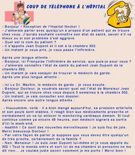 Merci Poffe et les autres dames mon fils va bien, mon mari ça va aussi mieux après l'intervention chirurgicale de son épaule il y a 2 mois environ il a encore de la kiné. . . et moi bof bof bof. . . :-O Idem des douleurs un peu partout mais bon. . .. il faut que je fasse attention aux aliments que je mange, j'ai le colon irritable puis je souffre de RGO c'est pénible, je pense que le stress y est pour beaucoup. . . :-S Pour mon poids, j'ai perdu 500g B-) Ah on dirait que le soleil veut pointer le bout de son nez, ça serait superbe !!! hier il a fait beau juste le vent qui est désagréable car très froid. . . Cet après midi je vais rendre visite à ma mère à chaque fois j'ai la boule au ventre avant d'y aller "c'est dur" la maladie l’Alzheimer . . .. faut que je positive "au moins elle est en sécurité là bas puis le personnel est sympa. j'en connais quelques un, j'ai travaillé dans le même établissement mais un autre service "maison d’accueil spécialisé" M.A.S., le médecin est un ami, c'est lui qui m'a aidé pour l'évaluation concernant la santé de ma mère et tout le reste. Pour midi je fais des cordons bleu "pas très diététique" lol c'est mon mari qui les a acheté :P avec des haricots verts pour mon fils je rajoute un féculent. . . ça y est mon fils vient de se réveiller, je vais aller lui donner à manger etc. . . je vous laisse et vous souhaite un agréable dimanche et surtout prenez bien soin de vous. . . :x Une image "HUMOUR" O:-) |