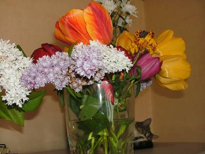 ROSI, je m'amusais à comparer les grammes et kilos en plaquettes de beurres, parfois même en portions hôtelières (10g). L'idée du sac à dos est géniale :-q , car peser ce que j'ai perdu a plus de portée que compter le nombre de plaquettes de graisse. PROSPER, ton expédition, ça se précise ? Je vous joins des photos promises car ma fille m'a installé le pilote qui me permet maintenant de mettre des photos à partir de l'ordinateur de bureau. (Je n'ai toujours pas récupéré mon ordi. portable envoyé en réparation). Là, voici un bouquet que j'avais constitué sous la pluie. . .le lendemain "j'atchoumais" ;) :D . Vous pouvez noter le lilas et le giroflet, fleurs très odorantes, et des tulipes violettes, c'est original. |