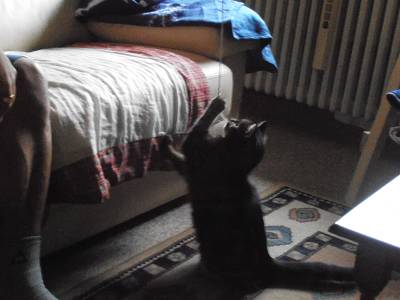 C'était le printemps 2010, une pauvre petite chatte errait autour de la maison. Elle avait l'air bien seule et pas de collier. Je lui ai mis une assiette de lait qu'elle a bu avec avidité. puis de semaine en semaine elle est restée, un jour de grosses chaleurs (T°) le 13juillet au soir elle s'installe à l'ombre sous un buisson devant la maison.Le 14 il y avait trois chatons à côté d'elle.L'un d'eux est mort tout de suite, les deux autres ont commencé à emplir notre vie.Un mâle et une femelle. Au début on croyait que c'était deux mâles, l'un tout en finesse et délicatesse, l'autre plus gros et plus dégourdi, ils nous faisaient penser à Terence Hill et Bud Spencer (tu vois qui c'est). Hélas nos bourrins de voisins qui conduisent comme des malades ont écrasé Terence. Bud rebaptisée Boudine puisqu'entre temps on a vu que c'était une femelle est restée. J'ai fait stériliser Gribouille dès que les petits ont éte sevrés et Boudine dès qu'elle a été en âge de l'être.Voilà leur histoire, notre histoire. C'est donc comme toi, c'est Gribouille qui nous a adoptés et non le contraire. Elle nous a choisis, pourtant il y en a des maisons dans le quartier!