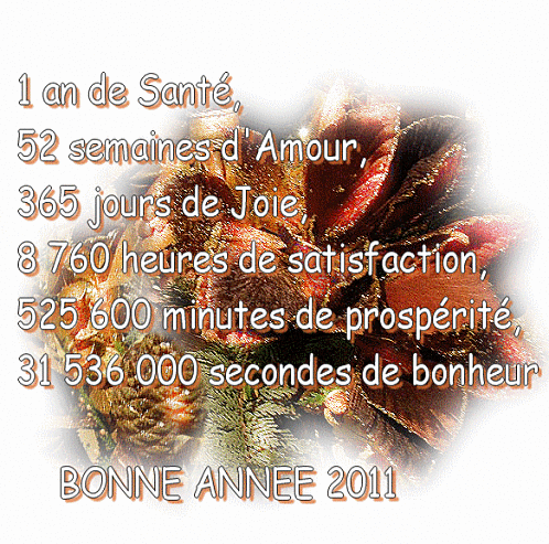 Je te souhaite de tout cœur d'y parvenir , tu donnes tellement à ceux qui t'entourent . . .! CAGOTTO je ne rajoute rien au message d'OCEANE . . . car j'y adhère tout à fait , si ce n'est , comme pour MINNE , que le gif se réalise pour toi et tes proches en 2011 !Le bonheur retrouvé et partagé . . . POMME DE REINETTE si tu repasses nous lire . . . tous mes vœux de bonheur et santé pour toi , ton mari et tes filles . JOJO merci de venir nous faire un coucou de temps en temps , merci pour tes vœux et à mon tour je te souhaite une très heureuse année 2011 et la réalisation de tes plus chers désirs ! Bonne journée à vous toutes mes copines du 23 février . . . mes copines depuis presque deux ans maintenant ! J'espère que nous ferons vraiment ce rassemblement chez moi fin avril 2011 . . .pour mettre enfin un visage et un son de voix (avec ou sans accent régional . . .! ;) ) sur tous ces pseudos comme je l'ai déjà fait avec MUMU puis KINOU ! :D Tous mes vœux pour la réalisation de cette rencontre . . . :-* :-* :-* :-* :-* :-* :-* :-* et bonne journée . . . |