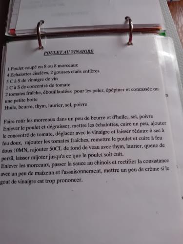 Je vous mettrais la recette du poulet au vinaigre, ce n'est pas très compliqué à faire, Maxime a adoré et en a même emmené. Je dois aussi te mettre la recette de la paëlla, Annie à faire avec Momo. Je n'oublie pas .