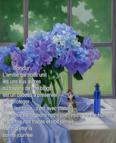 Notre Michèle est revenue. C'est vrai que le temps n'est pas beau, hier soleil et maintenant vent et pluie. Michèle tu reviens et c'est moi qui part. Nous allons rejoindre les futurs mariés au Cap Ferret chez des amis, nous allons peaufiner la préparation du mariage. Michèle si tu as notre Lyne au tél. fais de lui gros bisous de ma part. Capucine soignes toi bien, c'est ce sale temps qui nous rend malade. Léti tu va avoir un grand week end, tu va pouvoir profiter de tes hommes. Ed, Dany bonne fin de semaine. bisous les filles. |