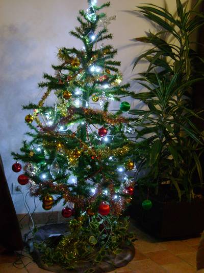 voilà une photo de mon sapin mais je me rends compte qu'il manque une guirlande il va fallloir que j'aille en acheter une ou deux demain