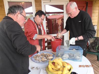 ouverture des huîtres oui mais J. Marc (breton ) est le + rapide !enfin un p'tit truc ne le répétez pas il triche un tout petit peu il les ouvre mais n'enlève pas les couvercles ;) ;) ;) (en fait c'est pour ne pas commencer a manger avant les autres !)